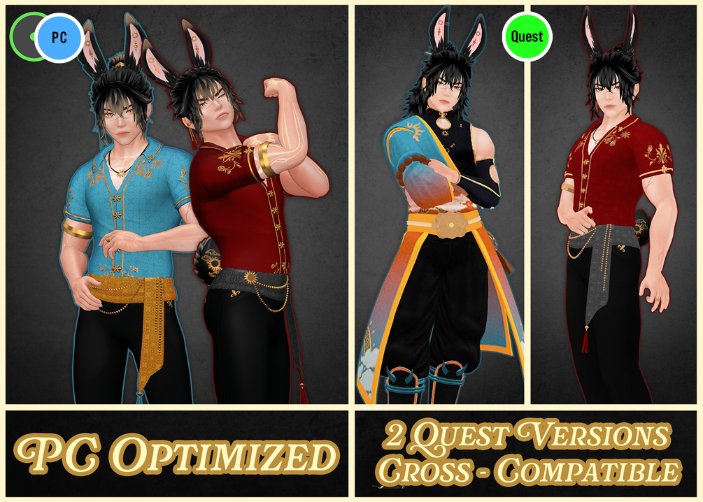 Hou Yi comes with multiple version presets! (there are a total of 10 different versions) This includes seperate PC unoptimized, PC optimized, and Quest versions. Both Solar (blue/orange color set) and Eclipse (red/black color set) are included in this package.