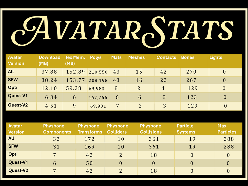 • This avatar uses JeTeesS' memory optimizer in order to create more parameter space on the face tracked versions. (DISCLAIMER! This causes other players to see some delay in the avatar's toggles. Regardless, other players will still see the same settings as you! It just may take an extra second or two to activate.)