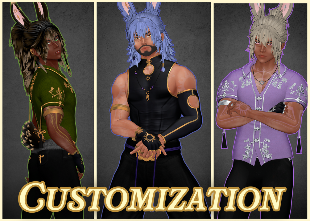 • Customization: Hair toggles (man bun, ponytail, long down) & Species toggles (bunny ears/tail, elf ears)